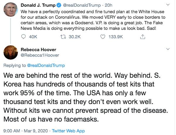 特朗普:“白宫制定了完美计划应对新冠病毒。虚假新闻媒体总是竭尽全力让我们看上去很糟糕。难过!”美国网友回复:“我们落后于世界,尤其是检测试剂盒,大幅落后于韩国。我们大多数人都没有口罩。”图/推特