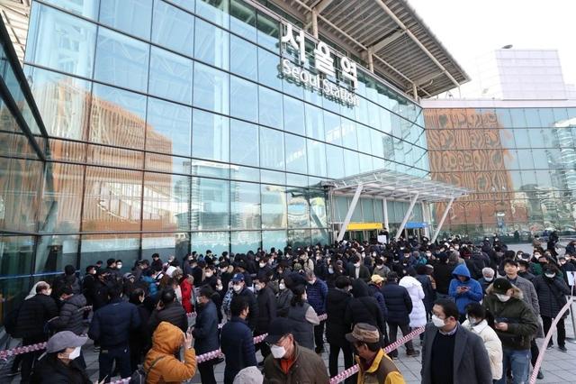 韩国首尔站前,市民排队买口罩。图/推特网友