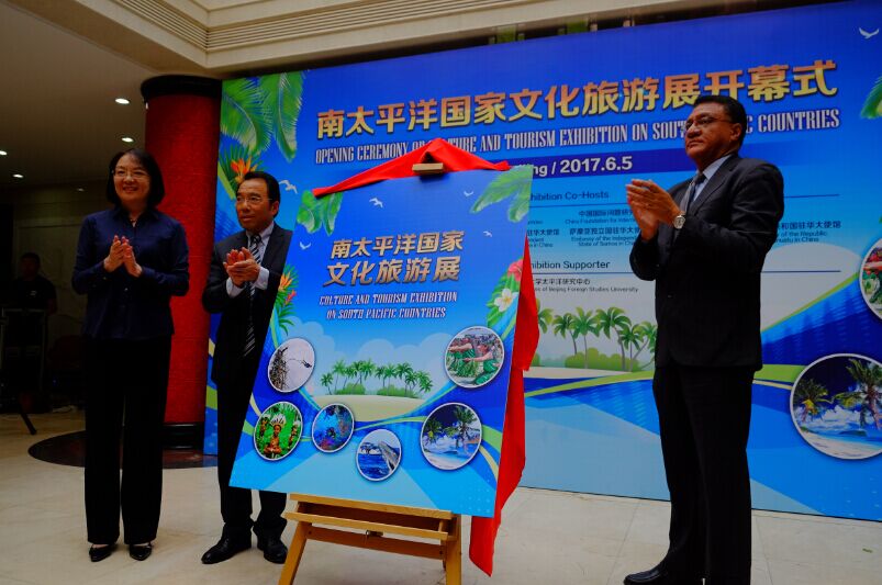 北京市对外友协常务副会长田雁(左)、中国国际问题研究基金会执行理事长沈国放(中)以及萨摩亚驻华大使(右)一起为南太平洋国家文化旅游展览揭幕。