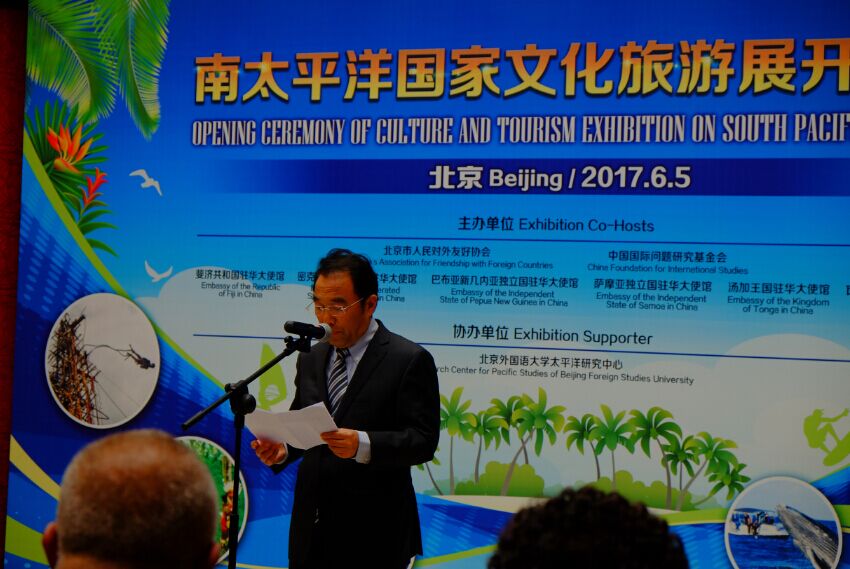 中国国际问题研究基金会执行理事长沈国放先生致辞说:“首先,我代表中国国际问题研究基金会热烈祝贺南太平洋国家文化旅游展隆重开幕。目前,‘一带一路’倡议进入实施阶段,经中国沿海港口到南太平洋的21世纪海上丝绸之路将让中国与南太地区国家在各个领域里的合作获得更大的发展机遇......今天各位大使代表的六国虽都是岛国, 但它们千姿百态,都具有各自的亮点。享有世界十大潜水地美名的巴布亚新几内亚;由332个岛屿组成的斐济,著名的古代建筑,土著遗风;密克罗尼西亚绝美的海岛风光,浪漫的草裙舞;萨摩亚的奇花异卉,保护完整的珊瑚群;全球每天第一个迎接太阳的汤加; 以潜水王国著称的瓦努阿图。所有这些特点都是世界上独一无二的。我本人曾经到过巴布 亚新几内亚,斐济,萨摩亚和瓦努阿图,这些国家人民的友好与热情,风光的秀丽,都给 我留下了非常深刻的印象。以前出访都是公务,我也非常希望以后有机会可以去深度旅游。”