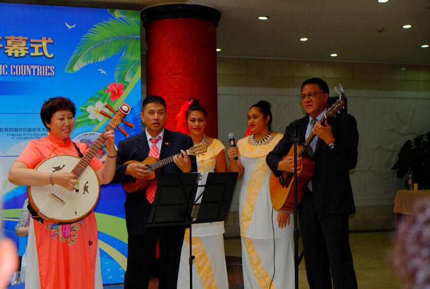 萨摩亚驻华大使塔普萨拉伊·特里·托欧玛塔先生(右1)以自己的歌声和弹奏表达南太平洋国家文化旅游展开幕的祝贺