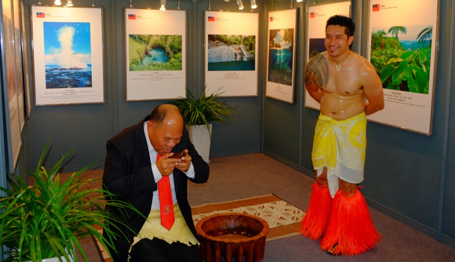 汤加驻华大使陶阿伊卡·乌塔阿图在萨摩亚王国图片展位上饮下萨摩亚民间舞者敬奉的萨摩亚汤