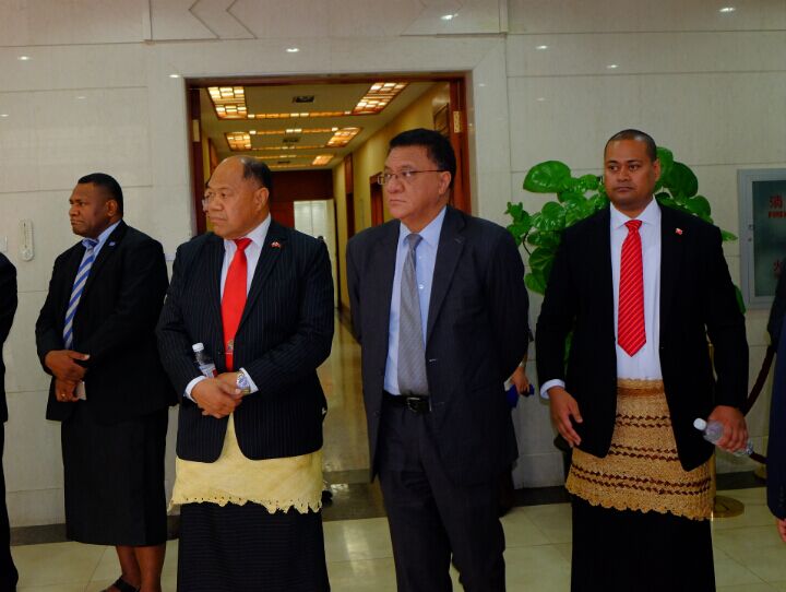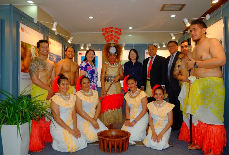 萨摩亚驻华大使(右2),汤加驻华大使陶阿伊卡·乌塔阿图(左2),瓦努阿图驻华一秘斯图亚特·马恩先生在南太平洋国家文化旅游展览开幕式迎宾