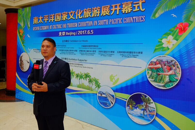 瓦努阿图驻华使馆一秘斯图亚特·马恩(右1)在南太平洋国家文化旅游展开幕式瓦努阿图展位上热情招呼