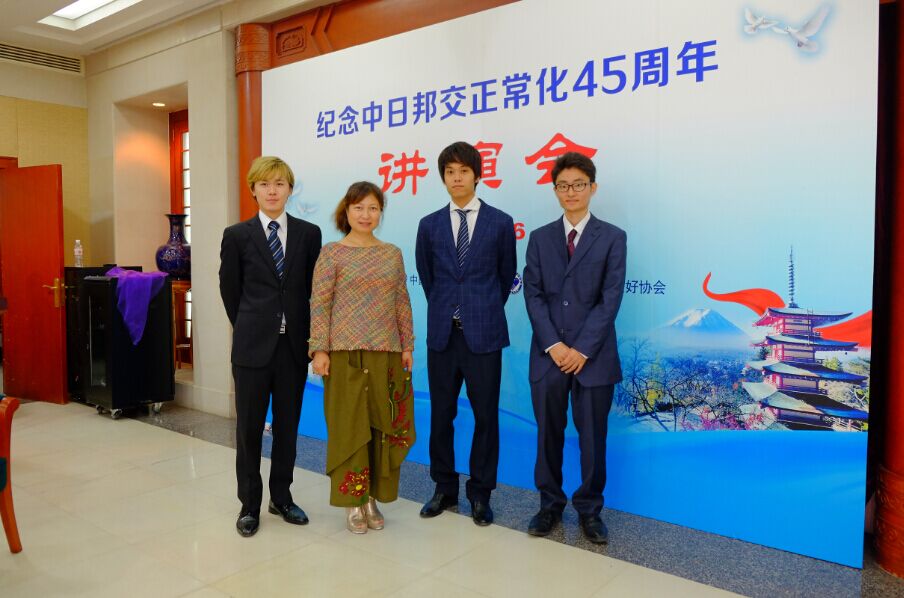 日本在华留学生参与组织了“纪念中日邦交正常化45周年讲演会”并与世界商人网董事总经理王晓玲(左2)合影留念