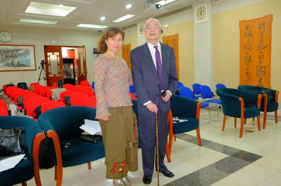 世界商人网董事总经理王晓玲与周恩来总理的外事秘书、中国驻日内瓦代表团前大使钱嘉栋老先生一起参加中国国际友人研究会主办纪念中日邦交正常化45周年讲演会并合影(资料照片)
