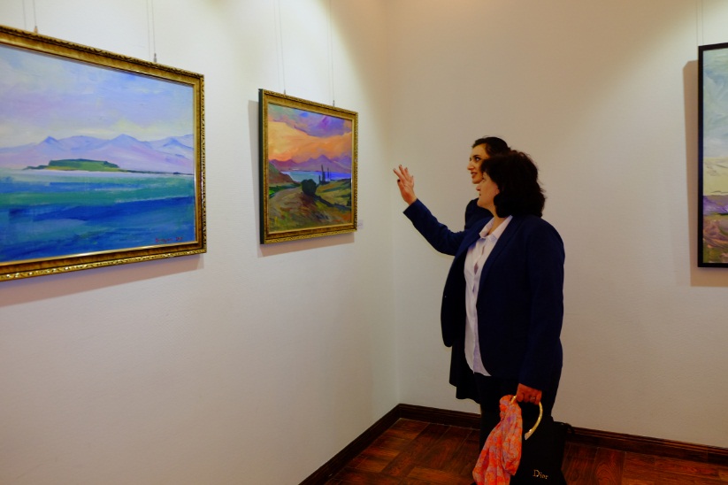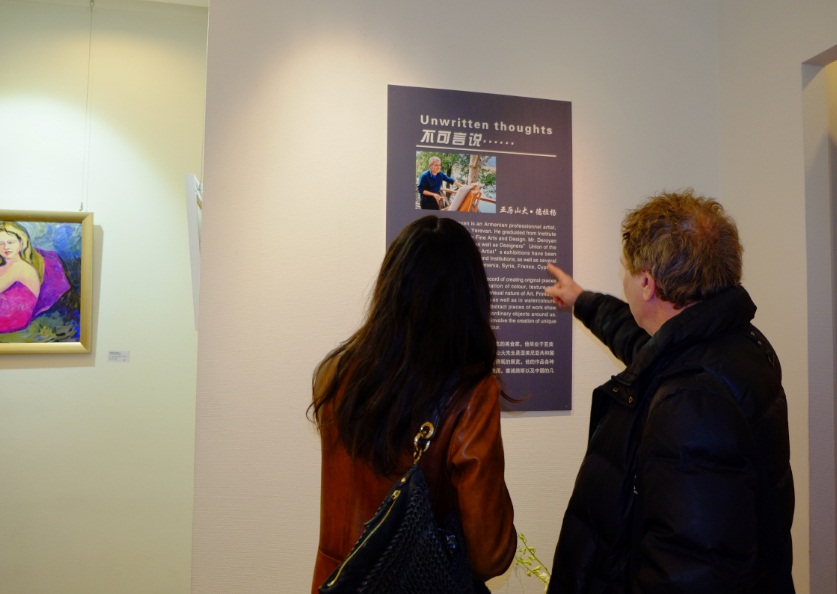 亚美尼亚驻华大使马纳萨良先生边欣赏画作,边听亚美尼亚前驻华使馆文化参赞齐列基扬茨女士介绍画作创作背景