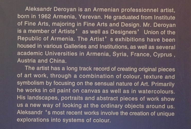 亚历山大·德拉杨生于1962年,毕业于亚美尼亚美术学院美术与设计专业,是亚美尼亚共和国艺术家联盟成员。参加过很多世界级的展览,他的作品被各种画廊和机构收藏和展览,叙利亚、法国、塞浦路斯以及中国的一些大学也藏有德拉扬的画作。