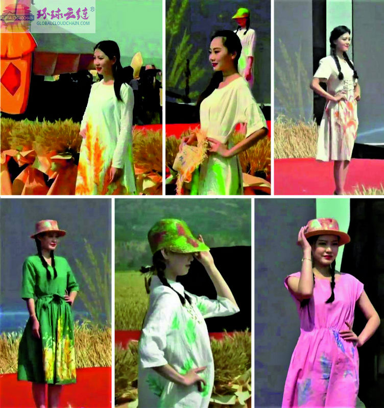 环球云链模特队表演的小麦主题服饰的绘制和走秀,智慧的设计师用艺术的方式表达生活,将悠久的黄河文明手绘在衣服上,用麦秆编织进草帽里