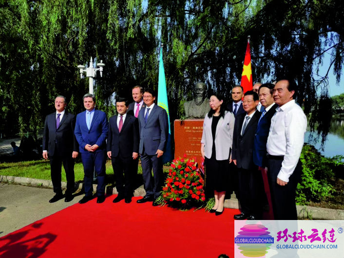 哈萨克斯坦驻华大使哈比特·柯依舍巴耶夫阁下与各国驻华使馆大使向哈萨克斯坦伟大诗哈萨克伟大诗人、思想家、启蒙者阿拜·库南巴耶夫雕塑敬献献花,缅怀这位哈萨克文化巨匠的不朽业绩。
