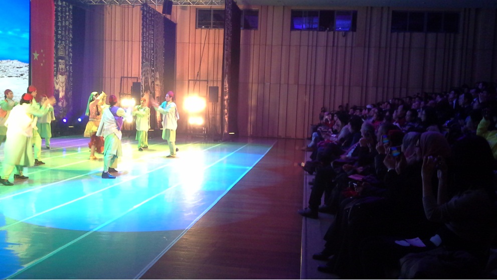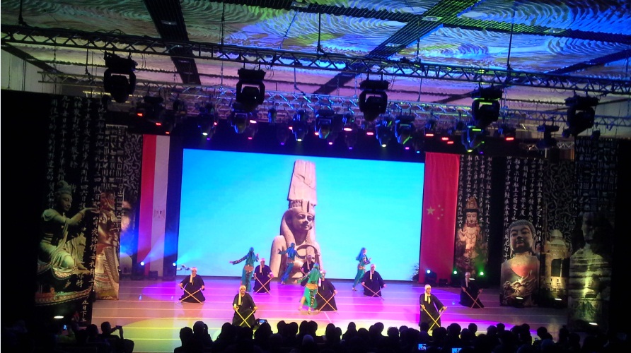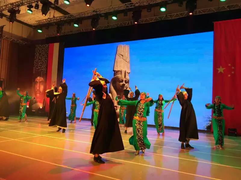 当埃及《转群舞》演员随着中国歌曲将中埃两国国旗展示在观众眼前,观众激情高昂,报以热烈的掌声,同时将本次演出推向高潮。