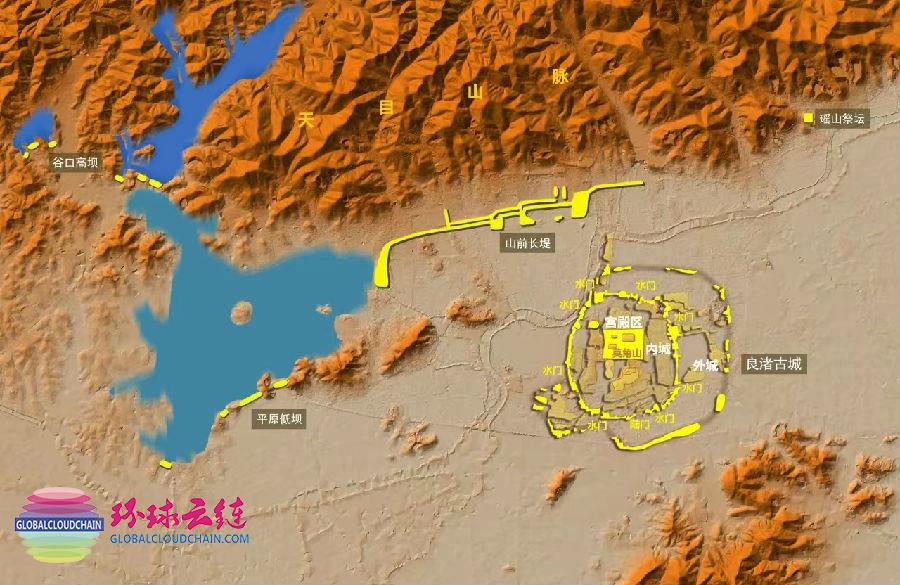 良渚古城遗址和大型水利工程示意图
